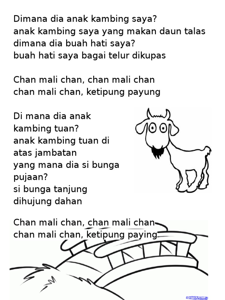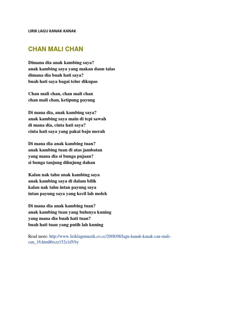 Lirik Lagu Chan Mali Chan - Chorus:chan mali chan, chan mali chan,chan mali chan, ketipung payungchan mali chan, chan mali chan.. Now we recommend you to download first result lagu kanak kanak melayu malaysia chan mali. Rx 10:45:00 am malay comment. It is a cheeky, flirtatious love song, which has gained standing as. Di mana dia, anak kambing saya Free chan mali chan dimana dia anak kambing saya lagu kanak kanak bahasa malaysia folk song malay mp3.