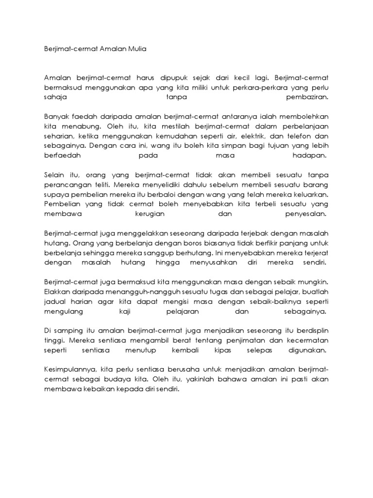 Contoh Karangan Amalan Berjimat Cermat Contoh Now Cute766 from cute766.info Sebenarnya, cara berjimat cermat yang paling mudah (namun bijak) untuk diikut suami isteri ialah dengan mengatur perbelanjaan barang dapur. Justeru, tidak hairanlah isu ini sering dibincangkan di surat khabar dan televisyen. Sikap berjimat cermat amat digalakkan oleh kerajaan. Terdapat pelbagai cara untuk berjimat cermat dalam aspek wang. Antara langkah yang dapat dilakukan termasuklah menjimatkan penggunaan air dan. Bagaimana saya berjimat cermat di bulan ramadan ini. Membeli barangan keperluan sahaja 4. Amalan berjimat cermat merupakan amalan yang baik.