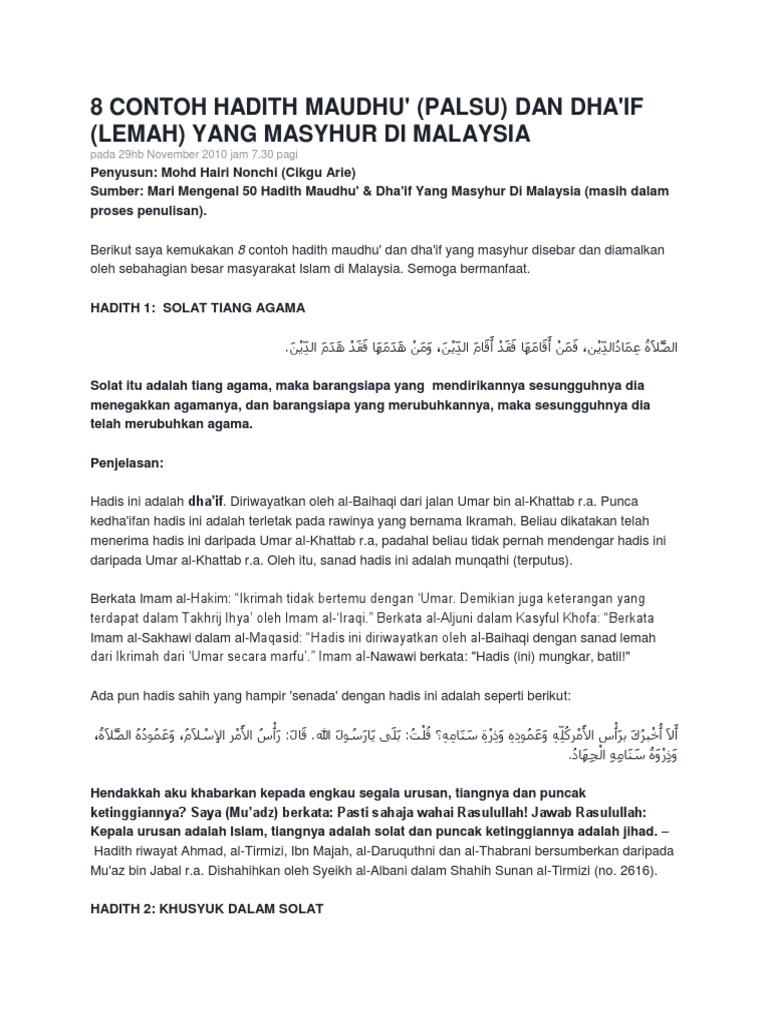 Makna lafadz hadits (sholat adalah tiang agama) dikuatkan dengan riwayat yang dikeluarkan oleh imam tirmidzi (no. Hadits kelima shalat tiang agama. Begitu juga dengan islam, bisa ambruk dengan hilangnya shalat. Nabi muhammad saw bersabda, sholat adalah tiang agama, barangsiapa mendirikannya maka sungguh ia telah menegakkan agama (islam) itu dan dalam hadits di atas dikemukakan bahwa penyangga atau penopang agama islam ini adalah sholat. Shalat adalah tiang agama, barang siapa yang mengerjakannya berarti ia menegakkan agama, dan barang siapa meninggalkannya berarti ia meruntuhkan agama (hr.